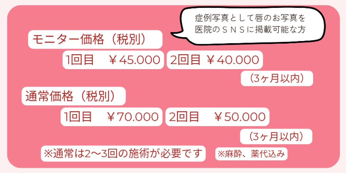 1度の施術で唇に入る色素の量に限りがありますので、通常2~3回の施術が必要です。