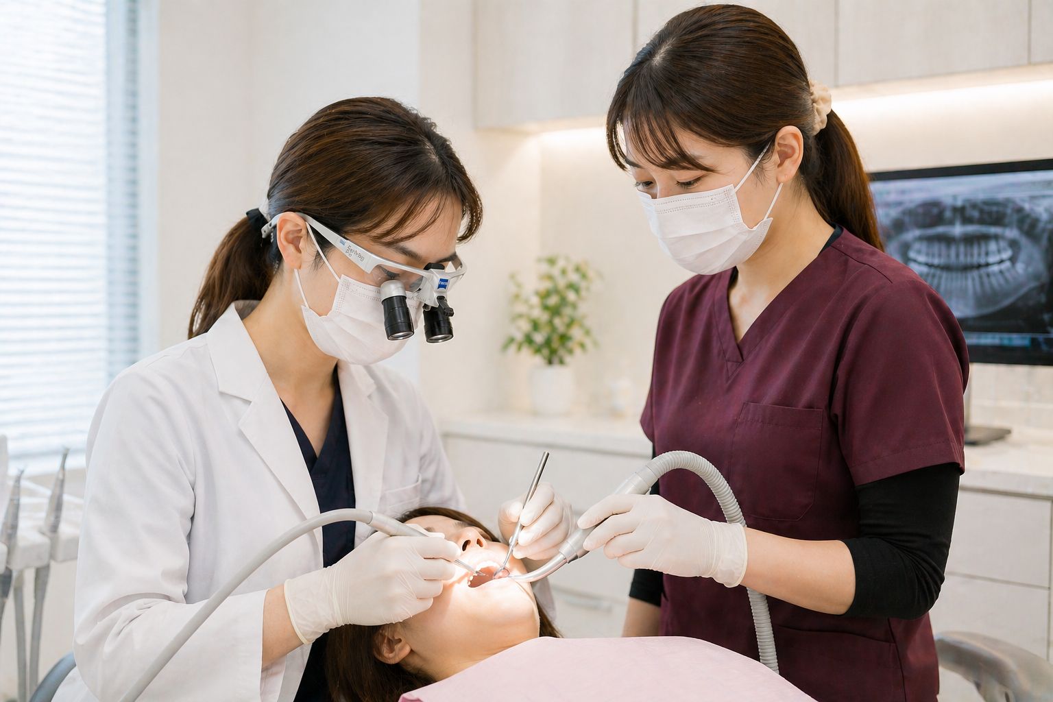 当クリニックでの治療では、むし歯を拡大して見ながら細かく治療を行います。肉眼では小さなむし歯は確認できず、治療も中途半端なものになってしまう可能性があります。当クリニックでは非常に明るいヘッドライト+高性能ルーペを使用して診療を行っております。